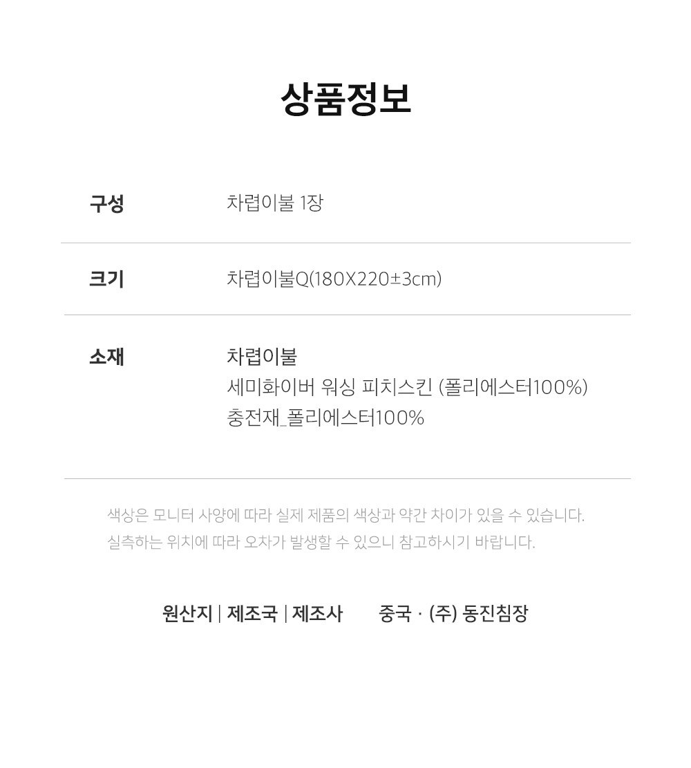 | 제조자,수입품의경우 수입자를 함계 표기: | (주)동진침장/해당없음 | ||